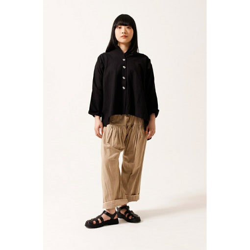 インドに昔から伝わる技法で創られるカディは、吸収性・速乾性にすぐれ、夏は肌に涼しく、冬は暖かく感じられるとても気持ちいい素材です。生糸を紡ぎ、巻き取り、織る・・・と多くを手作業で行います。そのため長い時間を必要とし、生地1Mの糸を紡ぐだけで1日もかかるほどです。手で引くカディの糸は機械では出しえないほどとても細く繊細です。こうして多くの人の手を経て、カディはとても温かみがあり味のある素材として生まれます。
