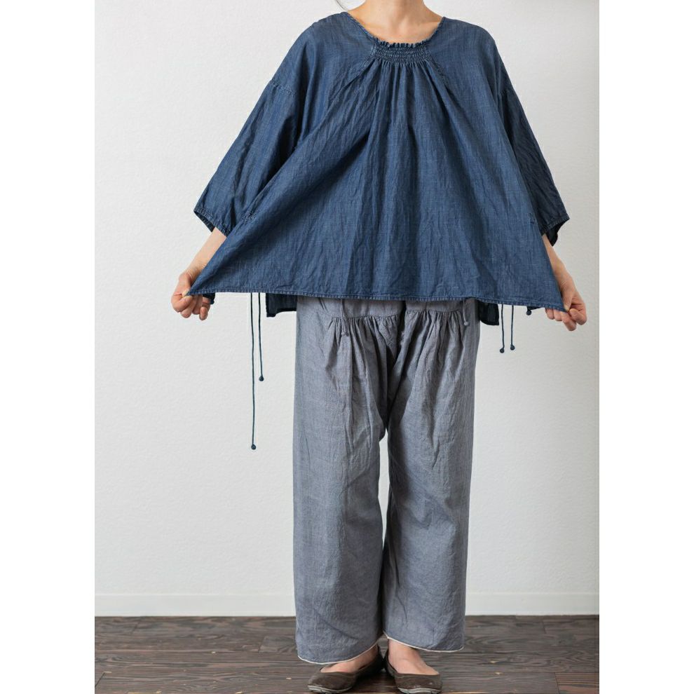 インド綿ならではの優しい風合いを活かしながら、シャーリング加工を施すことで伸縮性をプラス。さらりとした軽やかさがありながら、腕を動かしたり着脱の際にもストレスなくフィットします。