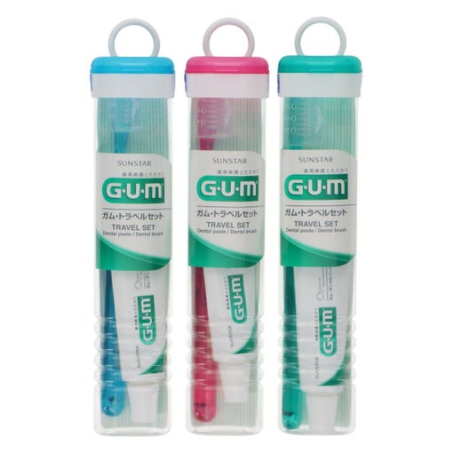 ガム・デンタルブラシ#211Mとガム・デンタルペースト25gを組み合わせた歯周病予防のトラベルセット。カラーはピンク、ブルー、グリーン、パープルの4色です。