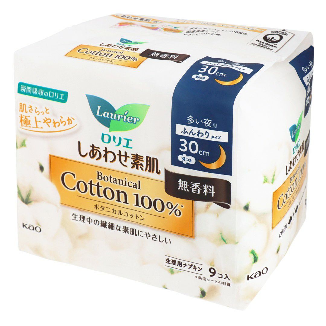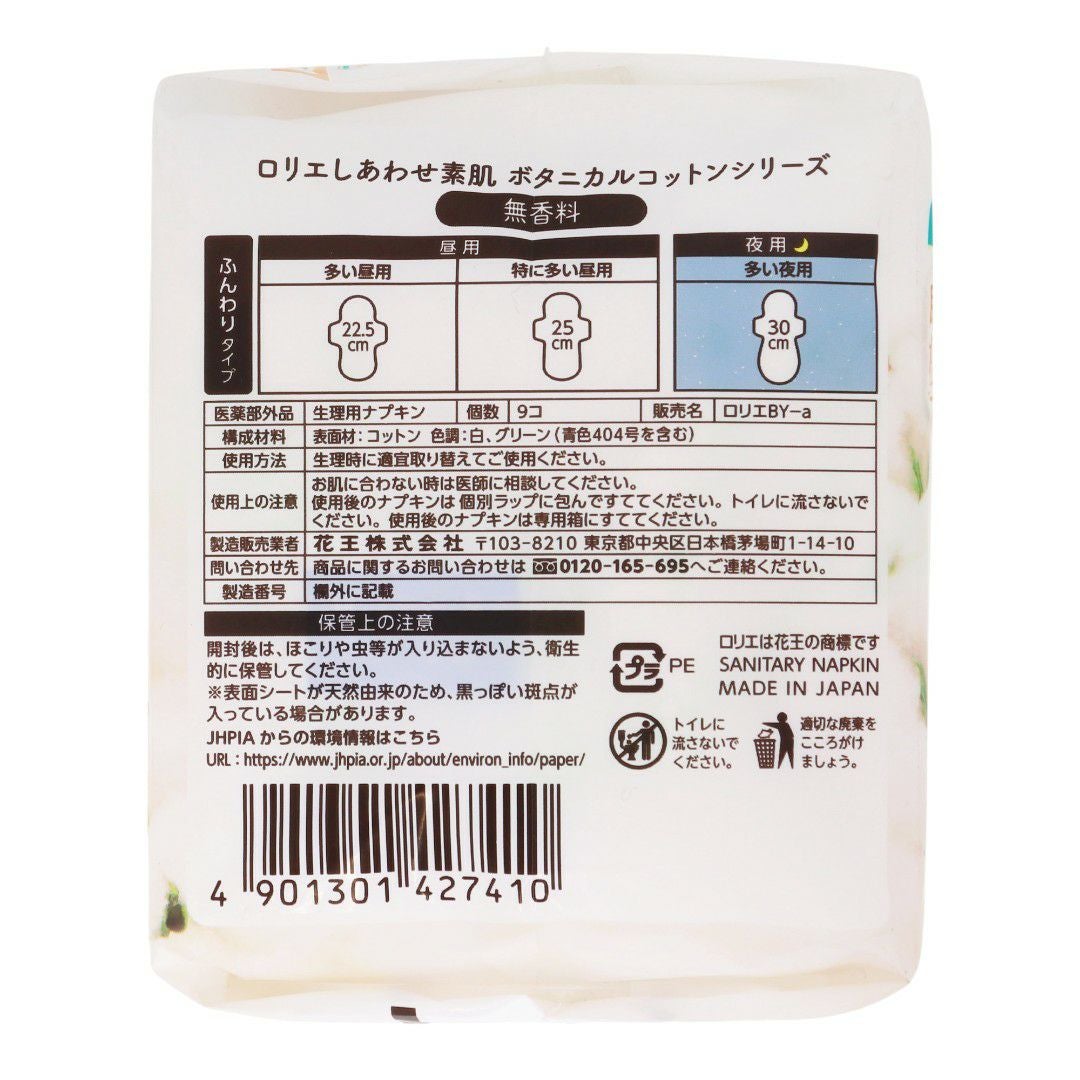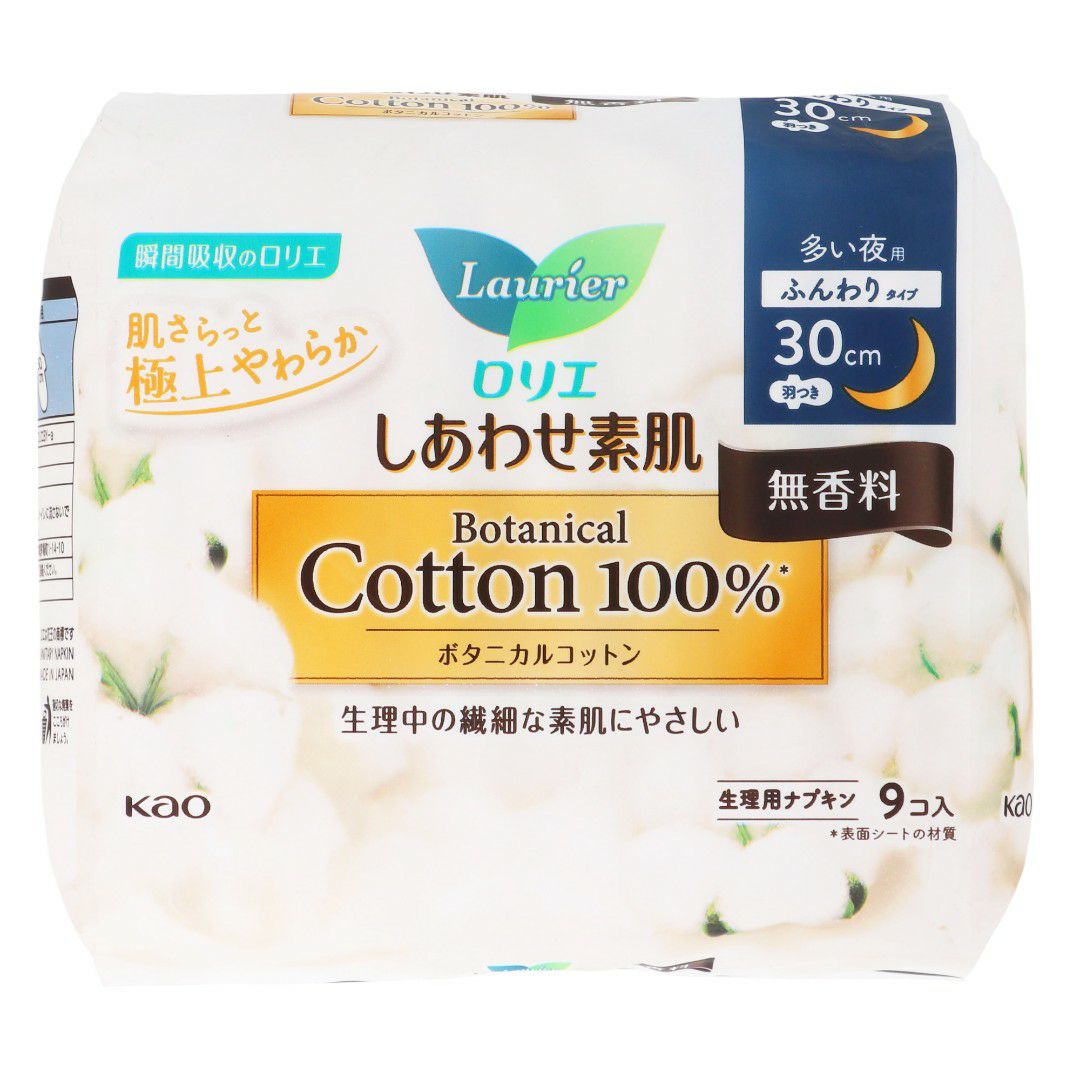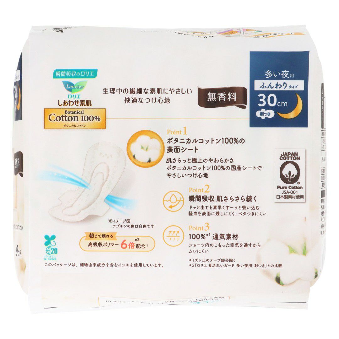 ロリエ しあわせ素肌 BOTANICAL COTTON100% 無香30多い夜用羽つき9コ