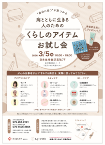 このたび、石川県金沢市にて、がん当事者の方がおすすめする商品を実際にお試しいただける「“自分に合う”がみつかる 病とともに生きる人のためのくらしのアイテムお試し会」を開催いたします。