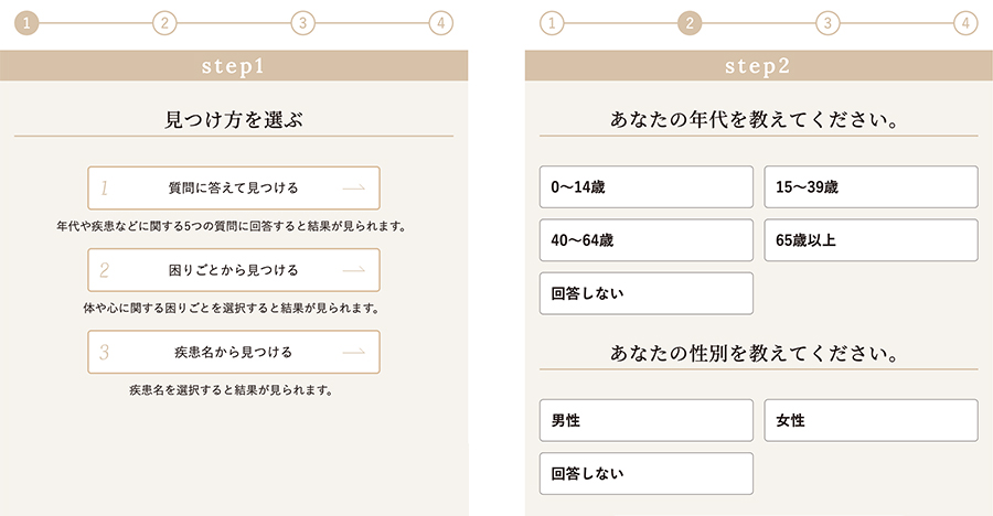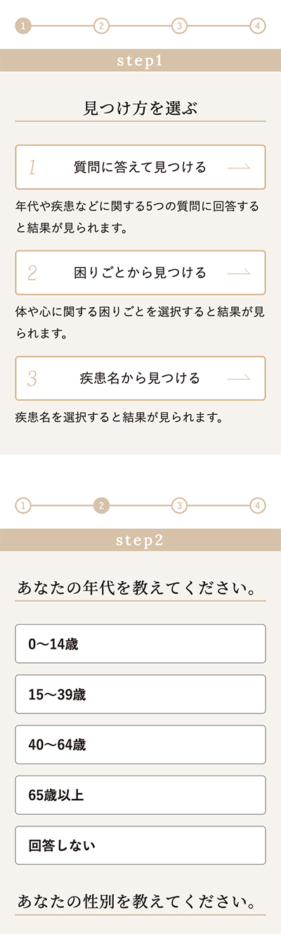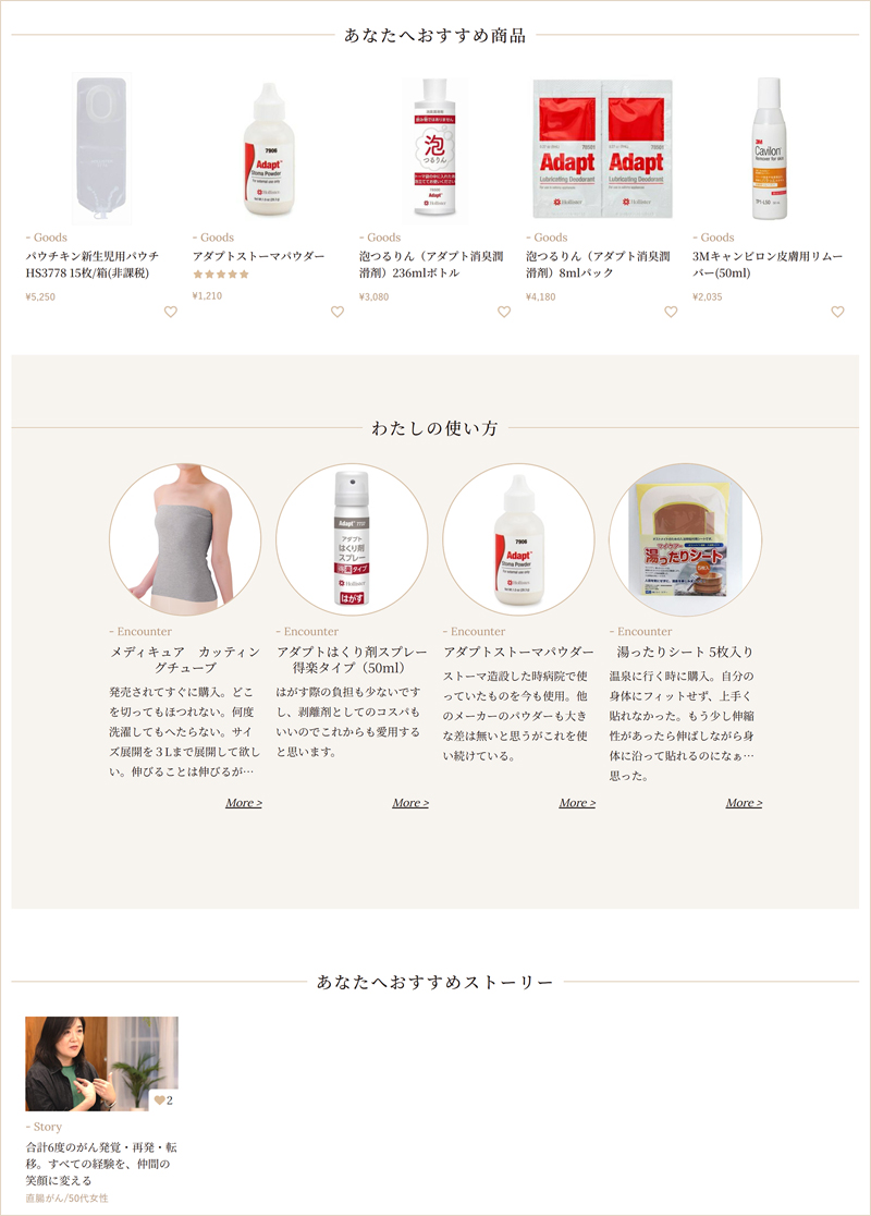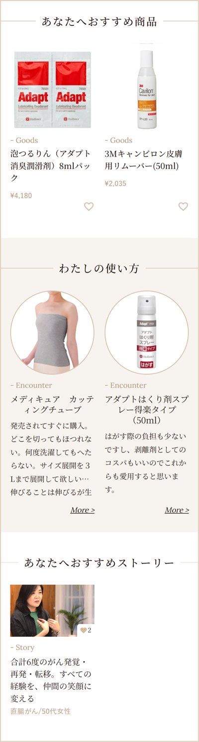 あなたの病気や困りごとを選択すると、罹患経験者の体験談(ストーリー)や、闘病生活中に役立つ商品を見ることができます。